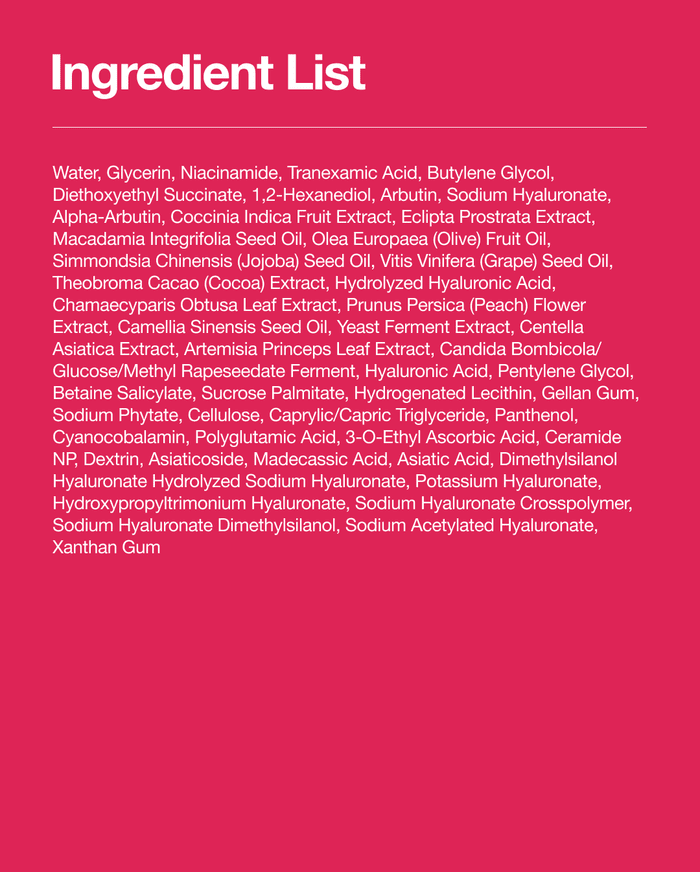 Water, Glycerin, Niacinamide, Tranexamic Acid, Butylene Glycol, Diethoxyethyl Succinate, 1,2-Hexanediol, Arbutin, Sodium Hyaluronate, Alpha-Arbutin, Coccinia Indica Fruit Extract, Eclipta Prostrata Extract, Macadamia Integrifolia Seed Oil, Olea Europaea (Olive) Fruit Oil, Simmondsia Chinensis (Jojoba) Seed Oil, Vitis Vinifera (Grape) Seed Oil, Theobroma Cacao (Cocoa) Extract, Hydrolyzed Hyaluronic Acid, Chamaecyparis Obtusa Leaf Extract, Prunus Persica (Peach) Flower Extract, Camellia Sinensis Seed Oil, Yeast Ferment Extract, Centella Asiatica Extract, Artemisia Princeps Leaf Extract, Candida Bombicola/Glucose/Methyl Rapeseedate Ferment, Hyaluronic Acid, Pentylene Glycol, Betaine Salicylate, Sucrose Palmitate, Hydrogenated Lecithin, Gellan Gum, Sodium Phytate, Cellulose, Caprylic/Capric Triglyceride, Panthenol, Cyanocobalamin, Polyglutamic Acid, 3-O-Ethyl Ascorbic Acid, Ceramide NP, Dextrin, Asiaticoside, Madecassic Acid, Asiatic Acid, Dimethylsilanol Hyaluronate, Hydrolyzed Sodium Hyaluronate, Potassium Hyaluronate, Hydroxypropyltrimonium Hyaluronate, Sodium Hyaluronate Crosspolymer, Sodium Hyaluronate Dimethylsilanol, Sodium Acetylated Hyaluronate, Xanthan Gum