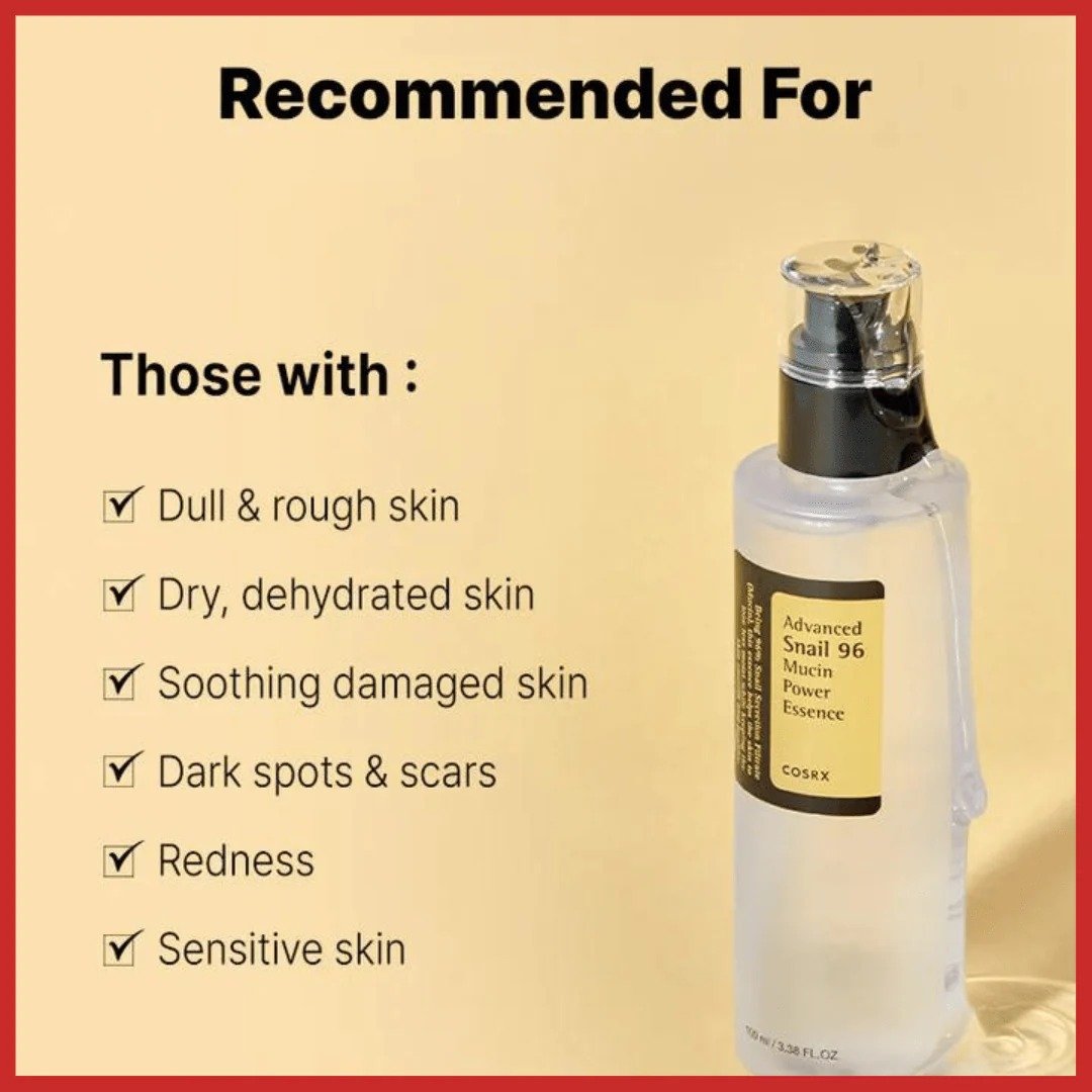 Cosrx Advanced Snail 96 Mucin Power Essence 100ml is a lightweight, hydrating essence formulated with 96% snail secretion filtrate to nourish and repair the skin. This gentle formula helps restore moisture, improve skin elasticity, and promote a smoother, healthier complexion. Its soothing properties make it ideal for sensitive, dry, or irritated skin, leaving it soft, supple, and rejuvenated.